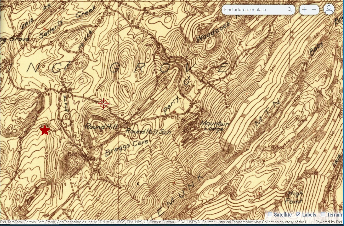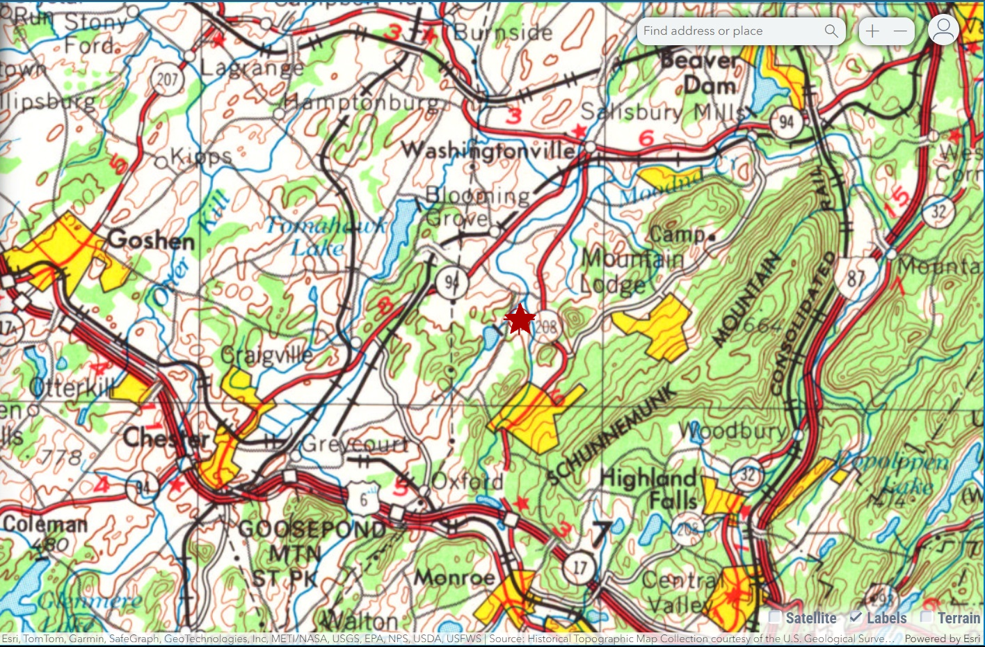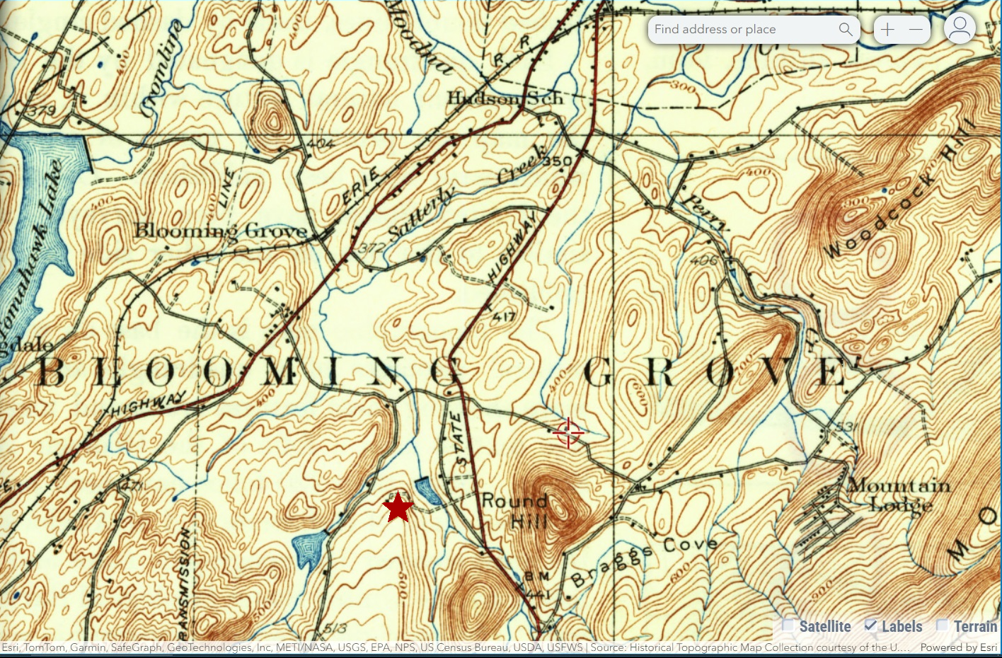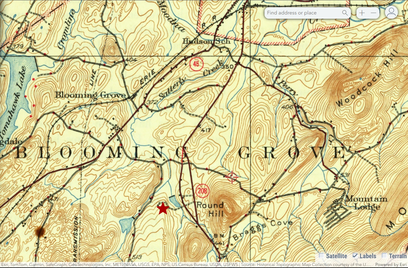 Mr. G's Round Hill LodgeAs early as 1930, the road up the hill to the "Main House" appears on historical maps of the region. (The red star on each map indicates where "The Lodge" was located in later years.) In subsequent geological surveys, there are mentions of a structure on the premises, built c.1920. But no further descriptions are made. Further research, to-date, make no reference to what that structure was or its use. On all maps, "Round Hill" is clearly noted and on the map of 1962-1977, "Mountain Lodge", which was, according to record, started ass a small camping community and became establisihed as a permanent residiential community after Word War II, is indicated. The history of the hill on which "Mr. G's" would become estabished with the entrance dirt road is recorded in the history of the region, and the local reference to it as "The Lodge" becomes sosme-what clear.